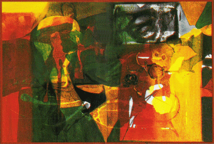 As for the faces themselves, they resemble masks. Inspired by African ritual symbology, these faces are a gallery of archetypes : nocturnal green stands for the forest, orange for fire and black for the unfulfilled animus. Large brooding eyes stare unflinchingly at us. Brinda has always been interested, not in the body as such, but in the many disguises and plastic representations through which it becomes known to us. Ominous Javanese masks, long-necked and Modiglianiesque African busts, an African sculpture with children crawling out of a womb-like basket and many such artefacts, smelling of earth, adorn her living room. And, of course, there and seven chairs around the dining table : an image of urbane, domestic order subverted by the deliberate choice of an odd number.