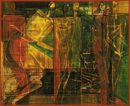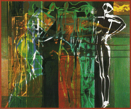 Even though Brinda's 'hollow men' are incarcerated in their respective grids, they sometimes make an attempt to lean on their neighbours, their 'dried voices' stirring towards birth. This brings us to the sequence of glass paintings, another medium in which Brinda enjoys working, because of its perfidious transparency.